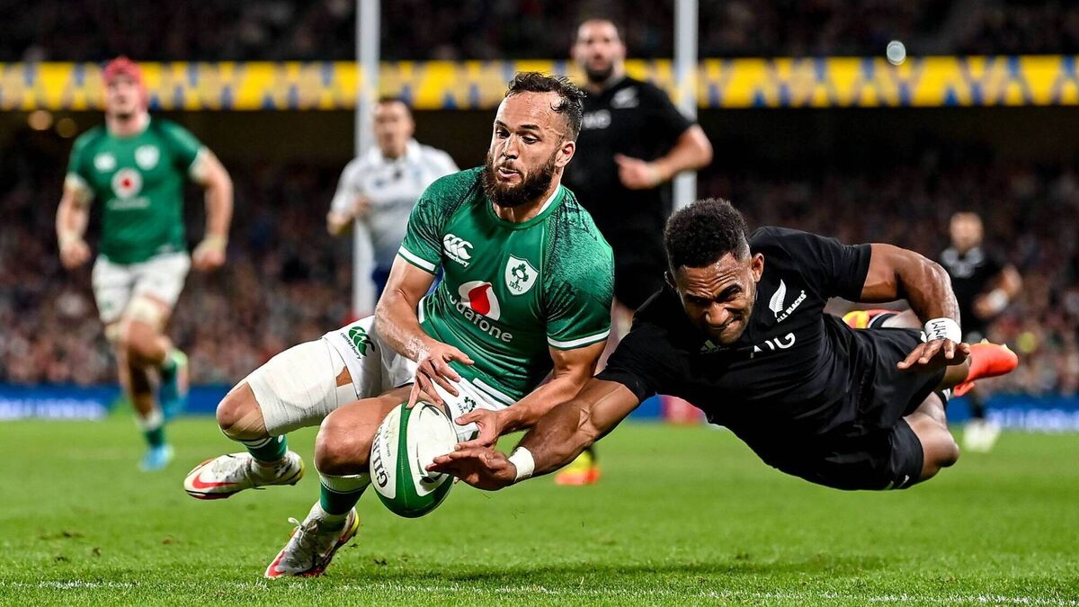 Jamison Gibson-Park of Ireland gets to the ball ahead of Sevu Reece of New Zealand to prevent a try during the Autumn Nations Series match last weekend. Picture: Brendan Moran/Sportsfile