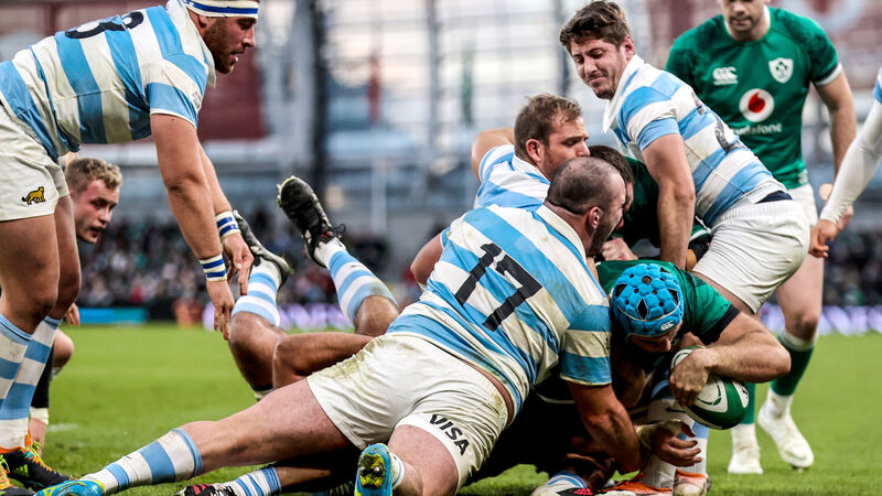 Ireland's Tadhg Beirne scores a try despite Ignacio Calles of Argentina. Picture: INPHO/James Crombie