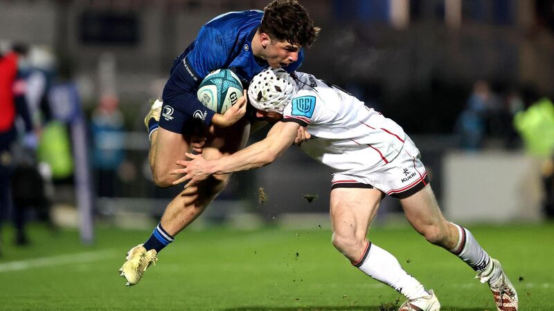 Leinster's Jimmy O’Brien is tackled by Mick Lowry of Ulster