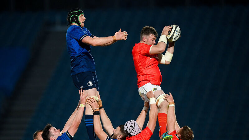 Peter O'Mahony of Munster wins possession in the lineout against Ryan Baird of Leinster during a PRO14 clash last season. Picture: Stephen McCarthy/Sportsfile