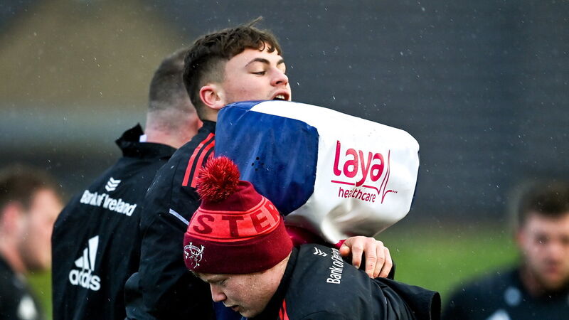 10 December 2021; Ethan Coughlan, bottom and Tony Butler during Munster Rugby squad training at University of Limerick in Limerick. Photo by Brendan Moran/Sportsfile