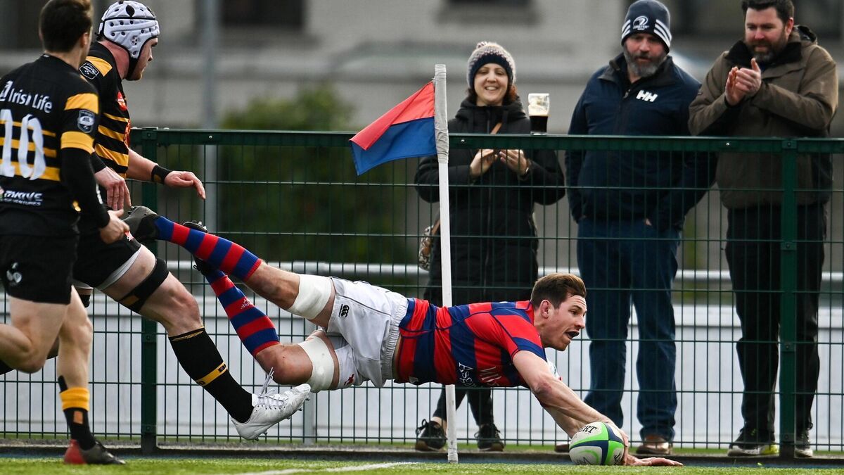19 February 2022; Adrian D'Arcy of Clontarf dives over to score his side's third try