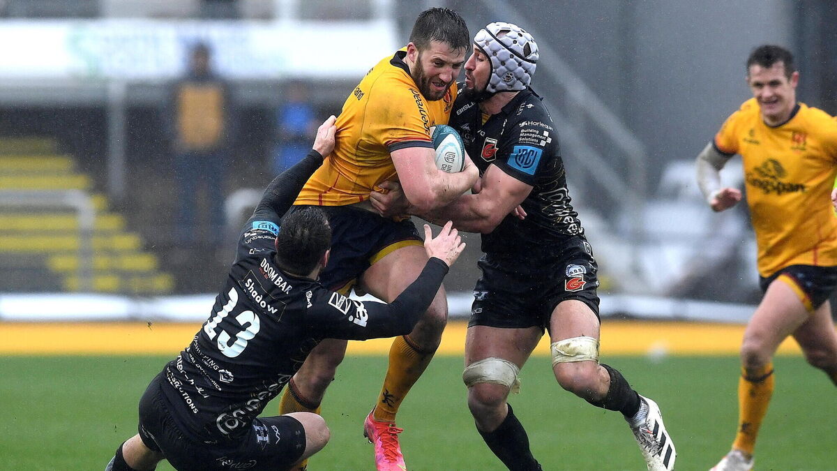 Ulster's Stuart McCloskey of Ulster is tackled by Adam Warren and Ollie Griffiths of the Dragons during the United Rugby Championship match at Rodney Parade. Picture: Ben Evans/Sportsfile