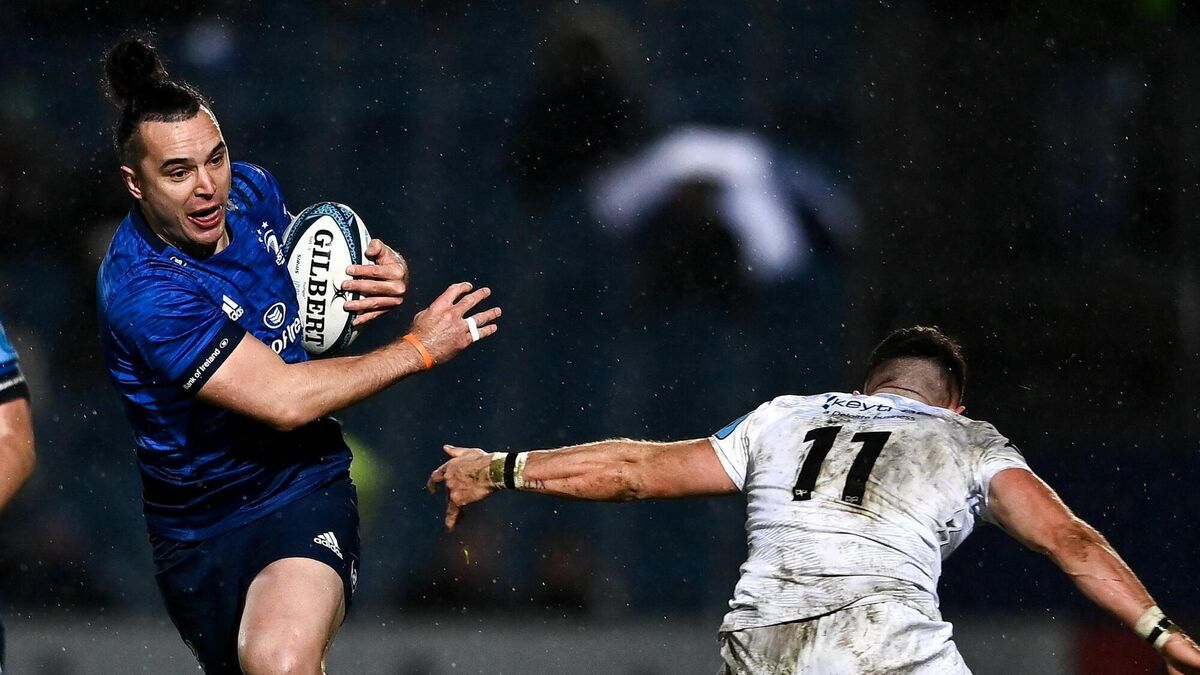 James Lowe of Leinster evades the tackle from Luke Morgan of Ospreys on his way to scoring his side's third try during the United Rugby Championship match at the RDS on Friday night