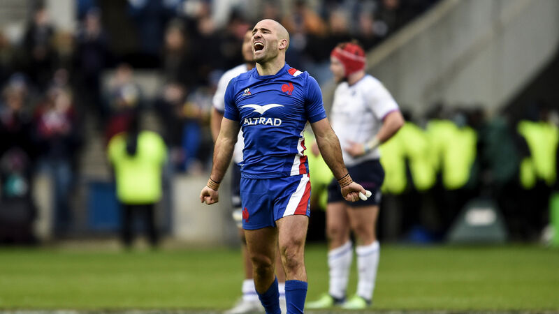 France's Maxime Lucu celebrates their win over Scotland at Murrayfield at the full-time whistle. Pic: INPHO/Ian Rutherford