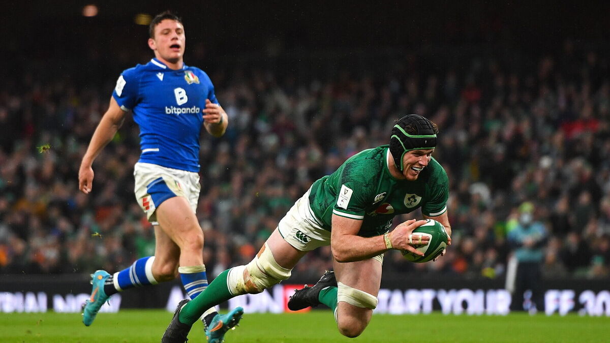 27 February 2022; Ryan Baird of Ireland scores his side's seventh try during the Guinness Six Nations Rugby Championship match between Ireland and Italy at the Aviva Stadium in Dublin. Photo by Seb Daly/Sportsfile