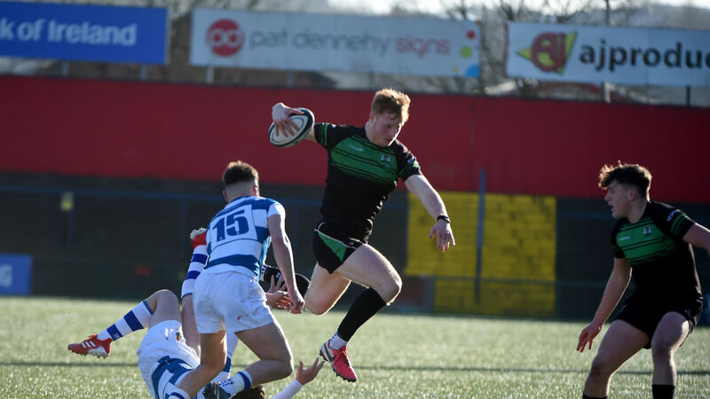 Bandon Grammar School’s Peter O’Sullivan jumps clear of the challenge by Rockwell College’s Conor Neville in their Munster Senior Cup clash at Musgrave Park last month. Picture: Larry Cummins