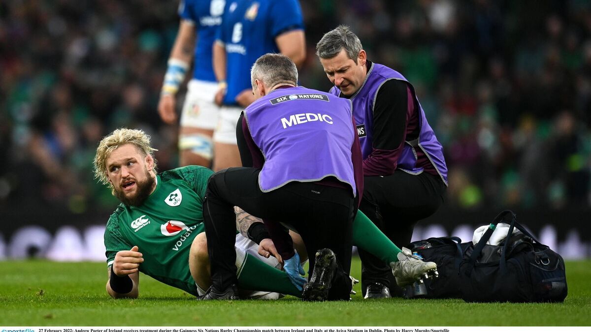 Andrew Porter of Ireland receives treatment during the Guinness Six Nations Rugby Championship match between Ireland and Italy at the Aviva Stadium in Dublin.