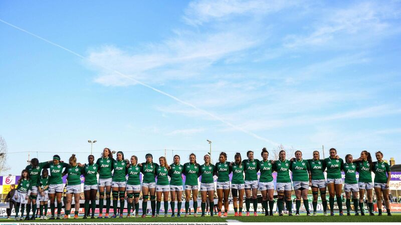 The Ireland team during the National Anthem at the Women's Six Nations Rugby Championship match against Scotland at Energia Park.