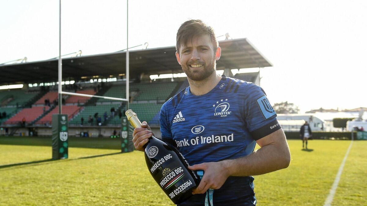 Man of the match Ross Byrne of Leinster with a magnum bottle of prosseco after the URC match against Benetton at Stadio di Monigo in Treviso