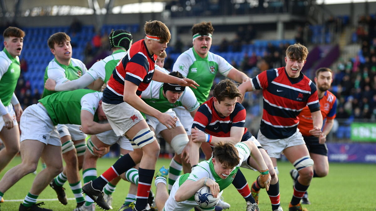 Tomas Noone of Gonzaga College scores his side's fourth try during the Bank of Ireland Leinster Rugby Schools Senior Cup 2nd Round match between Gonzaga College and Wesley College at Energia Park.Â