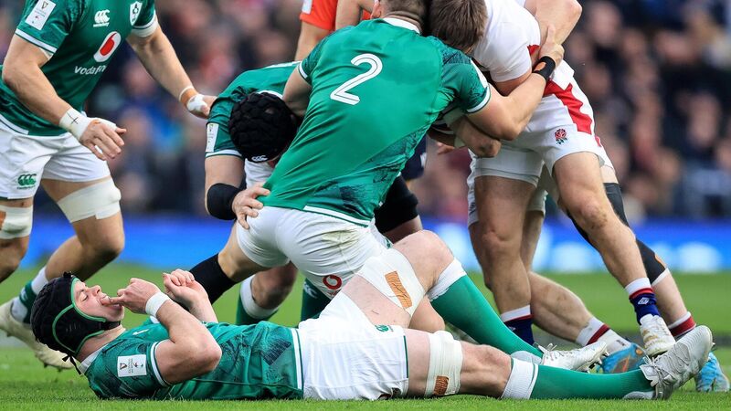 Ireland's James Ryan on the ground after a hit by Charlie Ewels of England which resulted in him being sent off. Ryan had to leave the game with a concussion. Picture: Billy Stickland/Inpho