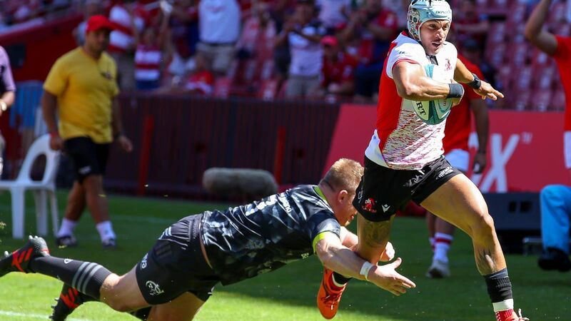 Edwill van der Merwe of the Emirates Lions runs in to score a try against Munster.