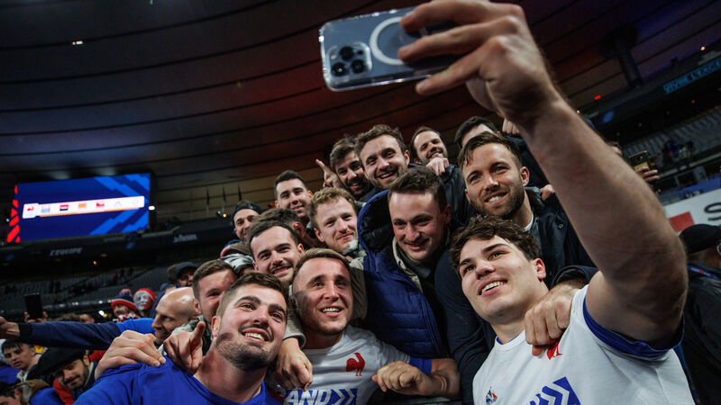 Grégory Alldritt, Anthony Jelonch and Antoine Dupont celebrates with fans after the game