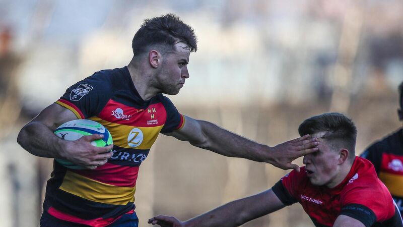 Lansdowne's Sean Galvin attempts to evade a UCC tackle in this afternoon's Energia AIL Division 1 clash at the Aviva Stadium back pitch