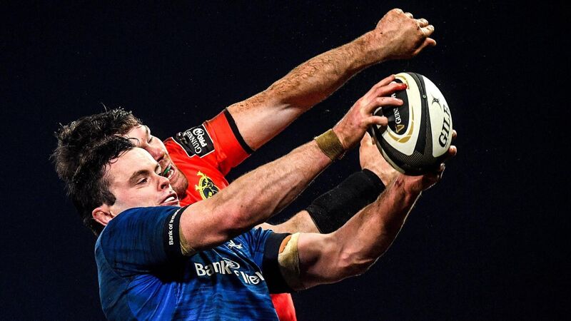 Leinster's James Ryan wins a lineout from Munster's Peter O'Mahony when the sides med in January 2021 at Thomond Park