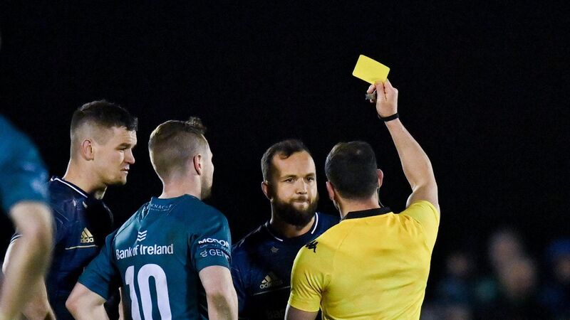 Jamison Gibson-Park of Leinster recieves a yellow card from referee Karl Dickson during the Heineken Champions Cup Round of 16 First Leg match against Connacht at the Sportsground