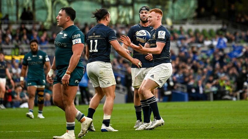 Four the province: Leinster winger James Lowe celebrates one of his quartet of tries with teammates Ciarán Frawley and Caelan Doris at the Aviva Stadium in Dublin. Photo: Harry Murphy/Sportsfile