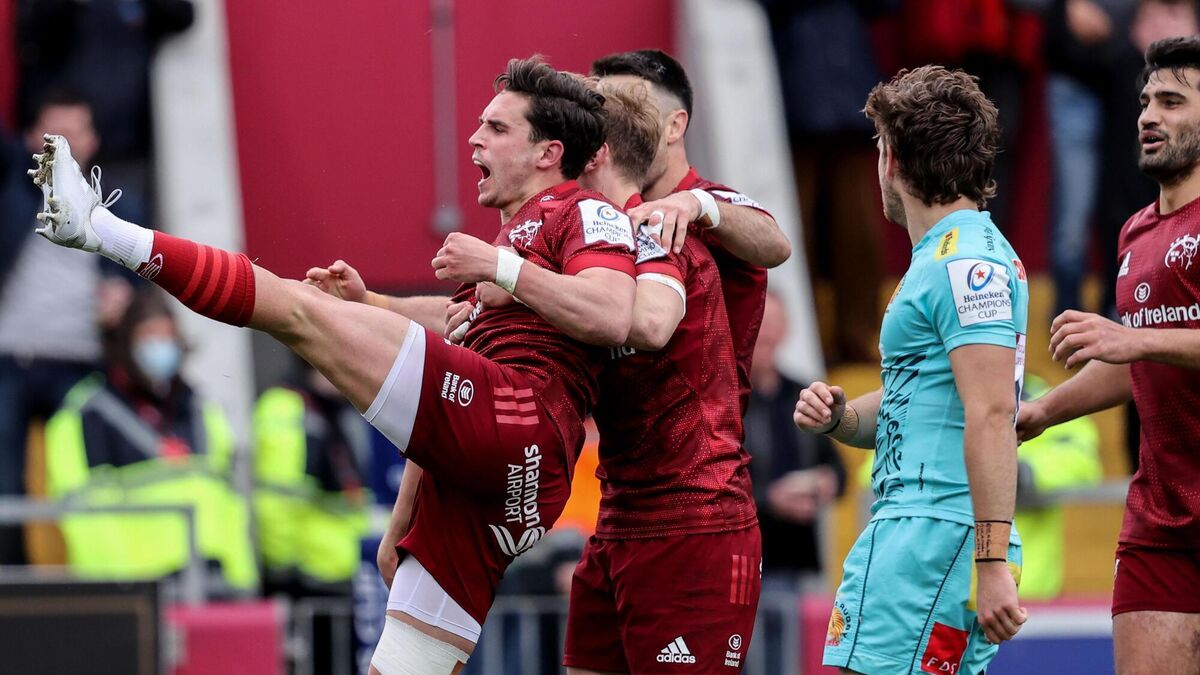 Munster's Joey Carbery celebrates after scoring a try in Saturday's Heineken Champions Cup last 16 second leg tie against Exeter