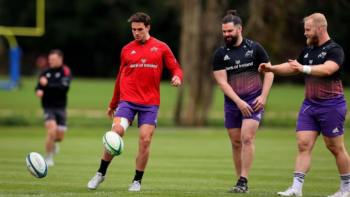 Limering up: Joey Carbery, Kevin O'Byrne and Jeremy Loughman at Munster training Tuesday. Photo: INPHO/Ryan Byrne