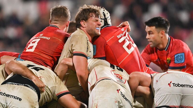 No pain, no gain: Jordi Murphy of Ulster feels the heat during the United Rugby Championship match between Ulster and Munster at Kingspan Stadium in Belfast. Photo: Ramsey Cardy/Sportsfile