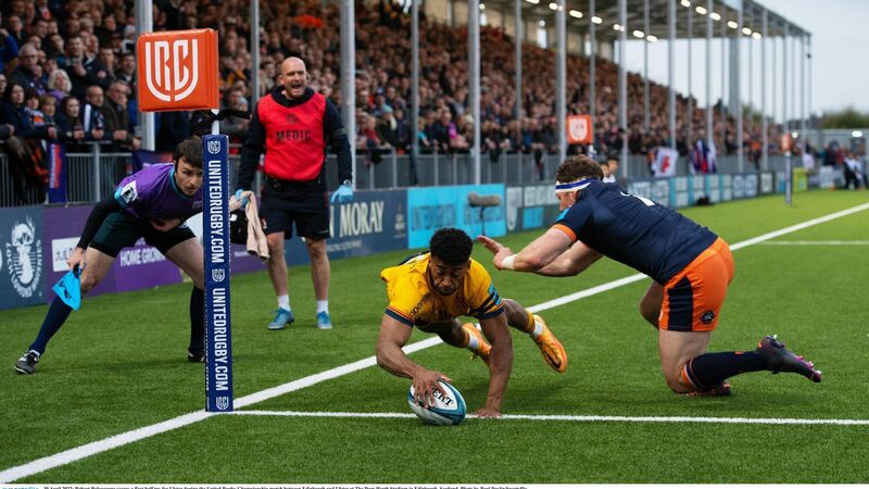 Right on the spot: Robert Baloucoune scores a first half try for Ulster during the United Rugby Championship match between Edinburgh and Ulster at The Dam Heath Stadium in Edinburgh, Scotland. Pic: Paul Devlin/Sportsfile