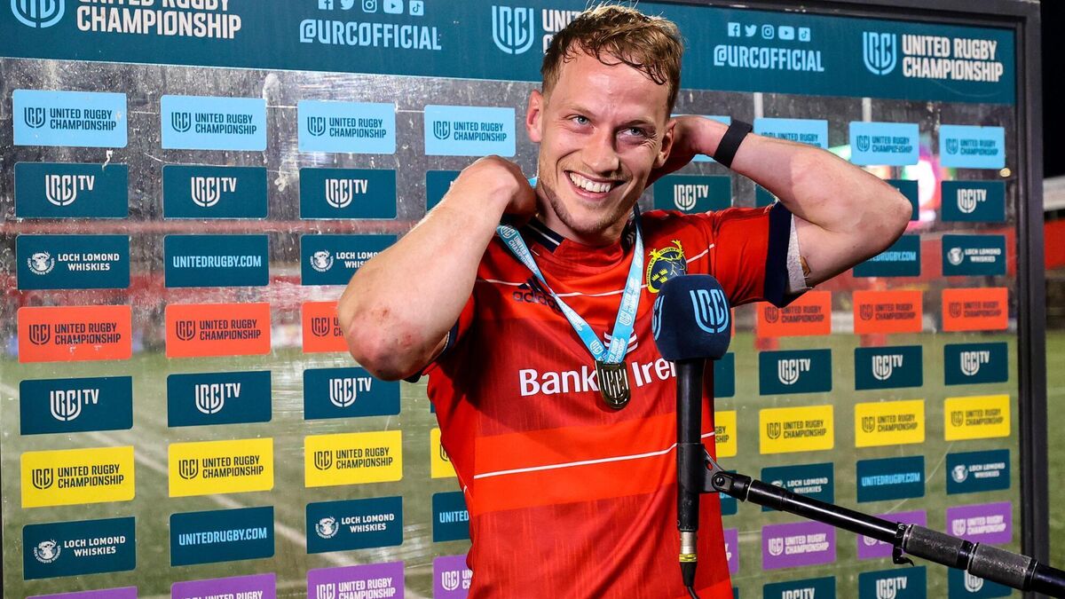 Munster's Mike Haley is presented with the URC Player of the Match medal. ©INPHO/Ben Brady