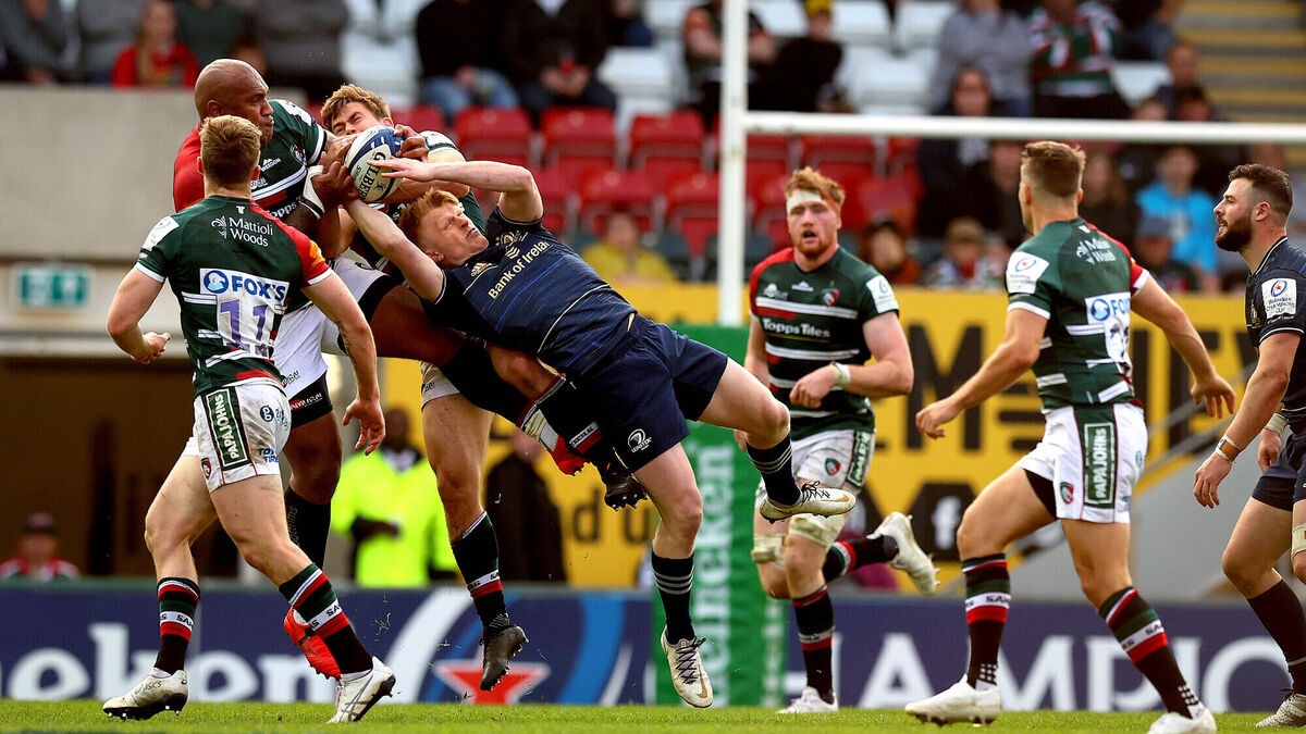 Leicester’s Nemani Nadolo and Guy Porter with Tommy O'Brien of Leinster