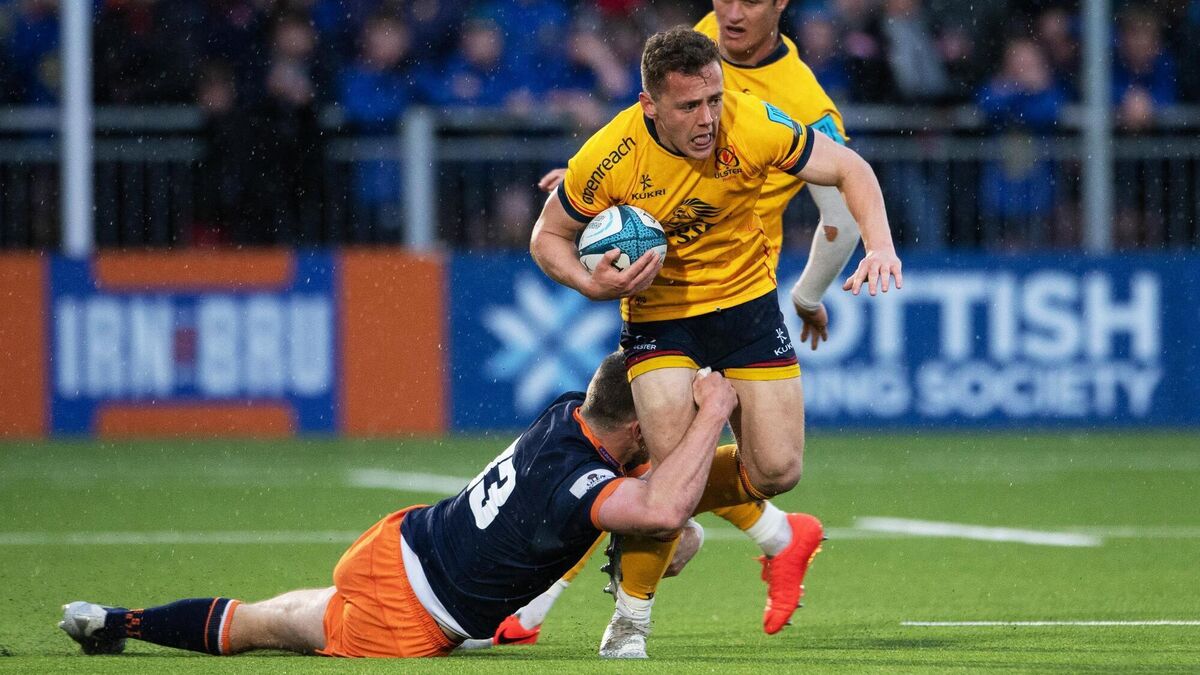 No letting up: Michael Lowry tackled by Mark Bennett during the United Rugby Championship match between Edinburgh and Ulster at The Dam Heath Stadium in Edinburgh, Scotland. Pic: Paul Devlin/Sportsfile