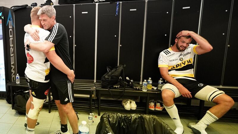 La Rochelle Head Coach Ronan O'Gara celebrates with his team in the changing room after the game. Mandatory Credit ©INPHO/Dave Winter