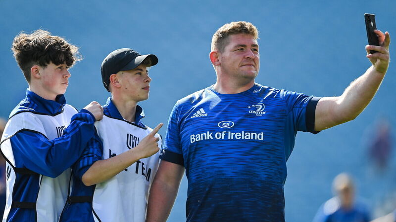 Tadhg Furlong of Leinster takes a 'selfie' with ballboys after the United Rugby Championship quarter-final at the RDSÂ