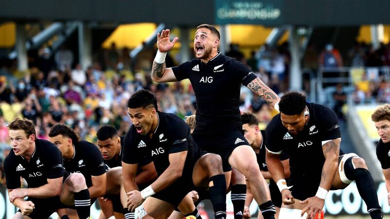 TJ Perenara of the All Blacks leads the haka ahead of the Rugby Championship match between the New Zealand All Blacks and the South African Springboks at QCB Stadium. (Photo by Chris Hyde/Getty Images)