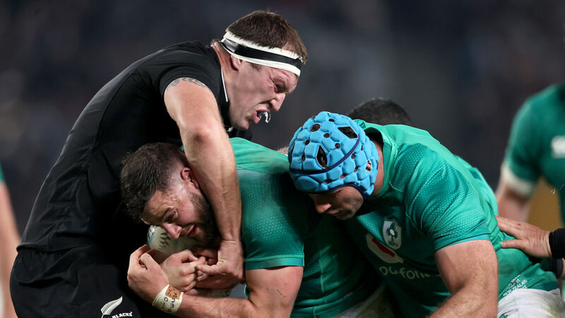 MISSING PARTNER: All Blacks Brodie Retallick with Ireland’s Robbie Henshaw and Tadhg Beirne. ©INPHO/Billy Stickland