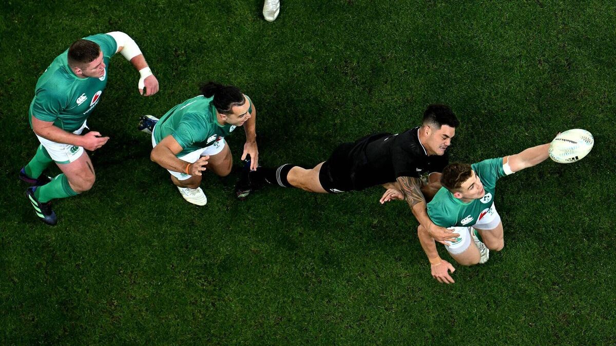 REACHING UP: Hugo Keenan of Ireland looks to secure the ball away from Quinn Tupaea of the All Blacks during the International Test match between the New Zealand All Blacks and Ireland at Forsyth Barr Stadium on July 09, 2022 in Dunedin, New Zealand. Pic: Joe Allison/Getty Images