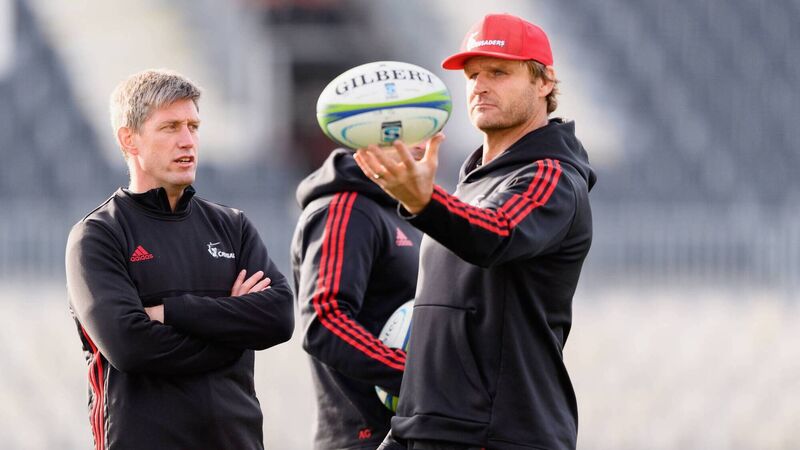OLD PALS: Assistant Coach Ronan O'Gara and Head Coach Scott Robertson on Crusaders duty in 2019 (Photo by Kai Schwoerer/Getty Images)