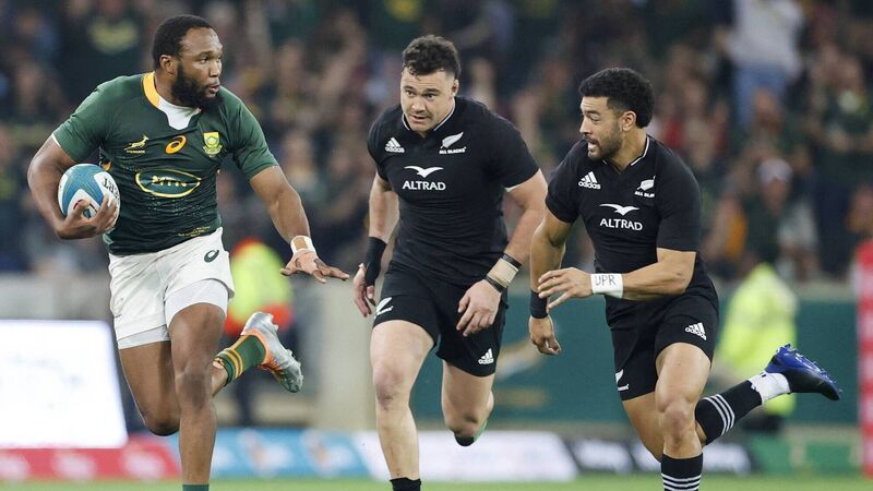 OUT: South Africa's center Lukhanyo Am (L) runs with the ball during the Rugby Championship. (Photo by PHILL MAGAKOE/AFP via Getty Images)