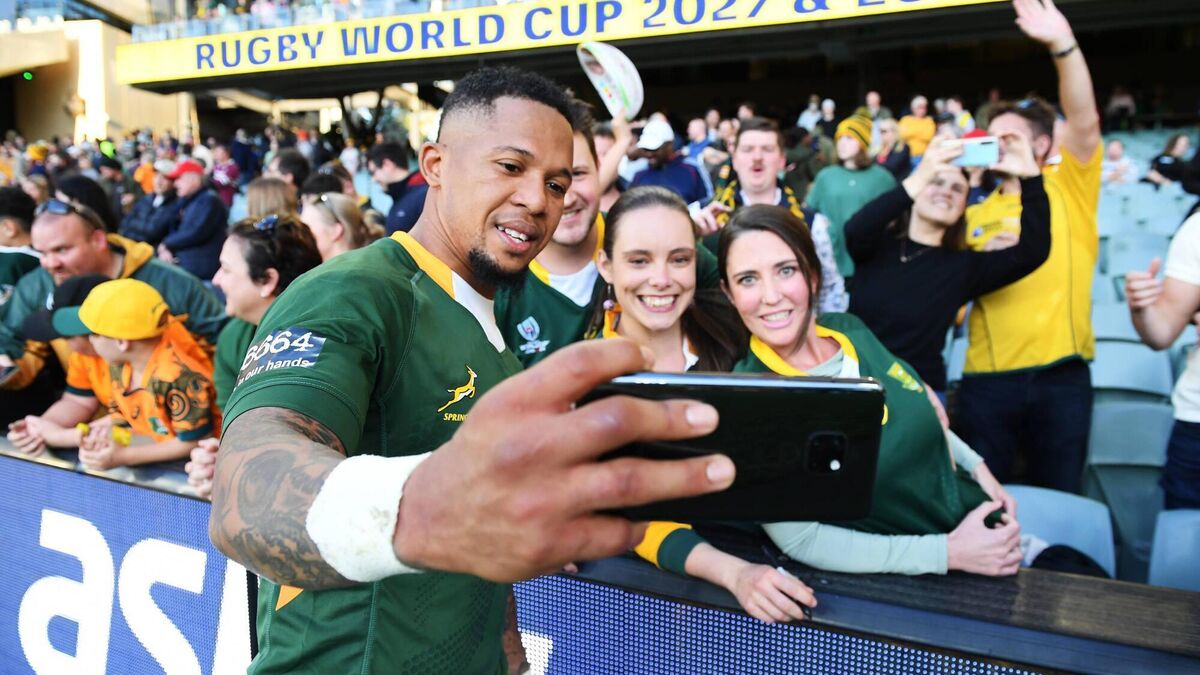 Elton Jantjies of the Springboks signs autographs and takes a selfie with the fans at Adelaide Oval last month.