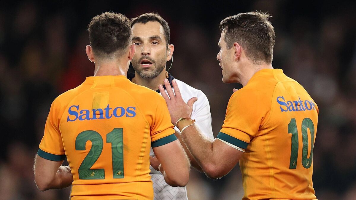 TIME-WASTING: Mathieu Raynal explains his decision to Australia's Nic White and Bernard Foley. Pic: Cameron Spencer/Getty Images