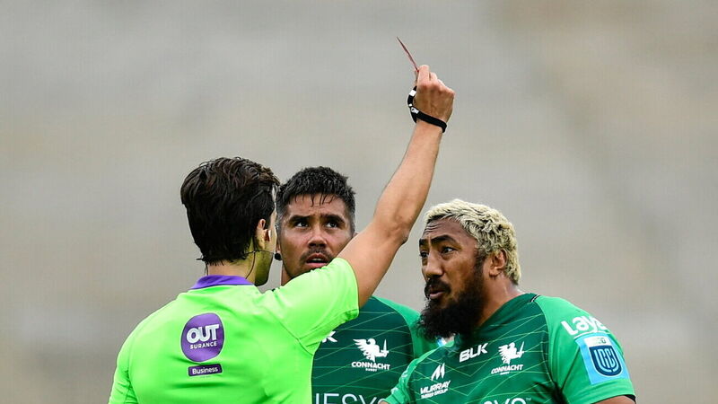 BANNED: Bundee Aki of Connacht is shown a red card by referee Gianluca Gnecchi during the United Rugby Championship match between DHL Stormers and Connacht at Stellenbosch in South Africa.