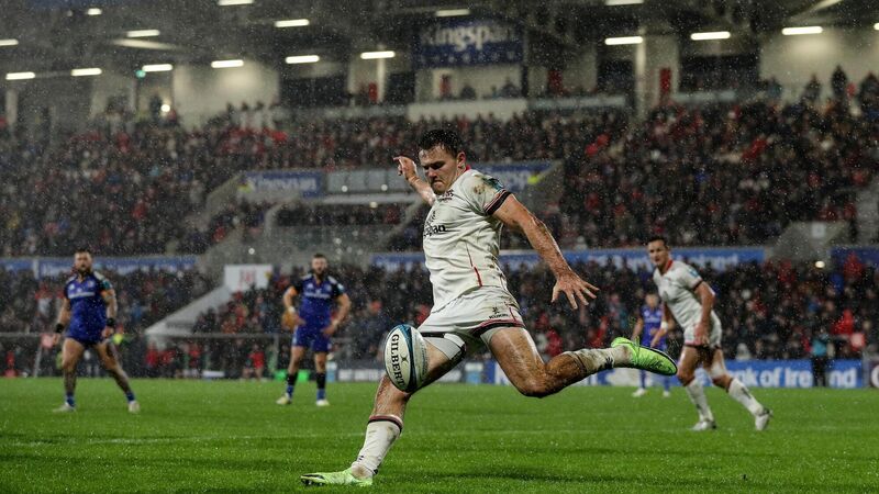 AWAITING NEWS: Ulster's Jacob Stockdale takes a kick in the bad weather conditions. Pic: INPHO/Ben Brady