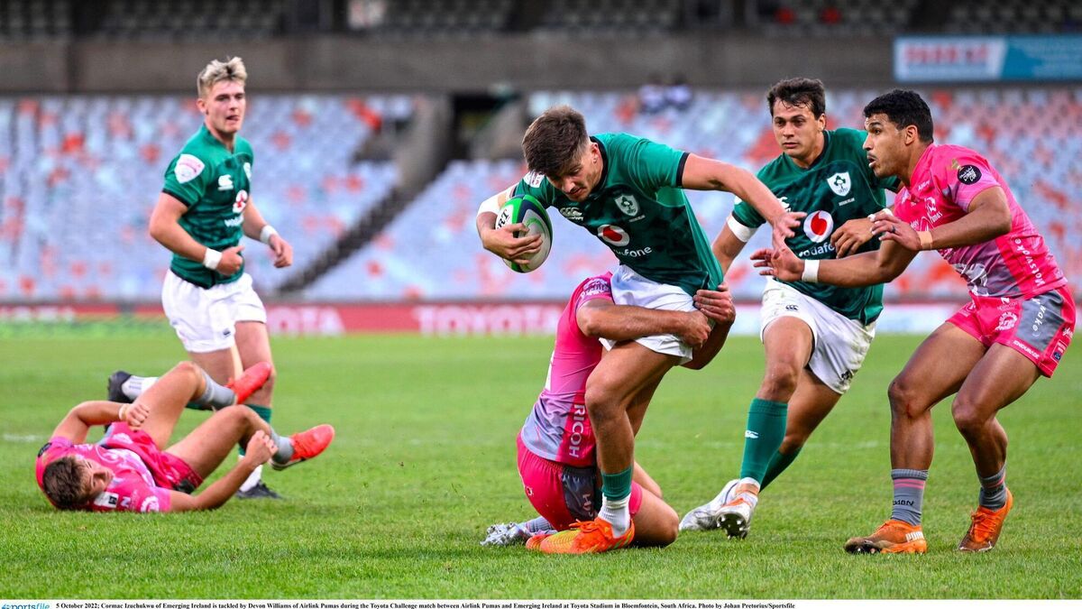 In the pink: Cormac Izuchukwu of Emerging Ireland is tackled by Devon Williams of Airlink Pumas during the Toyota Challenge match between Airlink Pumas and Emerging Ireland at Toyota Stadium in Bloemfontein, South Africa. Pic: Johan Pretorius/Sportsfile