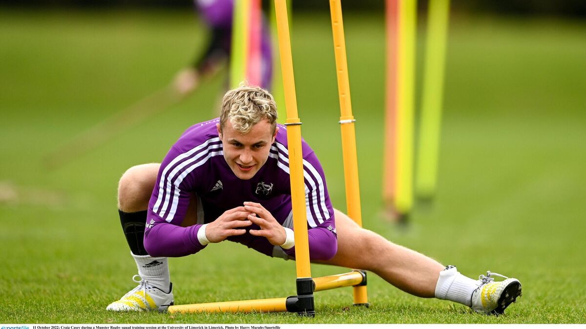 STRETCHING TO IMPROVE: Craig Casey during a Munster Rugby squad training session at the University of Limerick in Limerick. Pic: Harry Murphy/Sportsfile