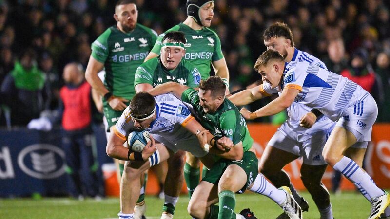 HOLDING ON: Joe McCarthy of Leinster is tackled by Jack Carty of Connacht during the United Rugby Championship match between Connacht and Leinster at The Sportsground in Galway. Pic: Harry Murphy/Sportsfile