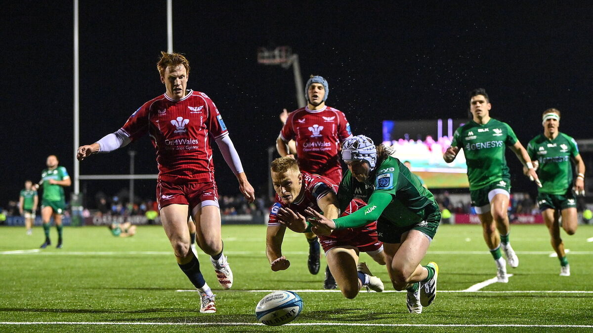 REACHING FOR IT: Mack Hansen of Connacht scores his side's fourth try despite the efforts of Johnny McNicholl of Scarlets during the United Rugby Championship match between Connacht and Scarlets at The Sportsground in Galway. Photo by Brendan Moran/Sportsfile