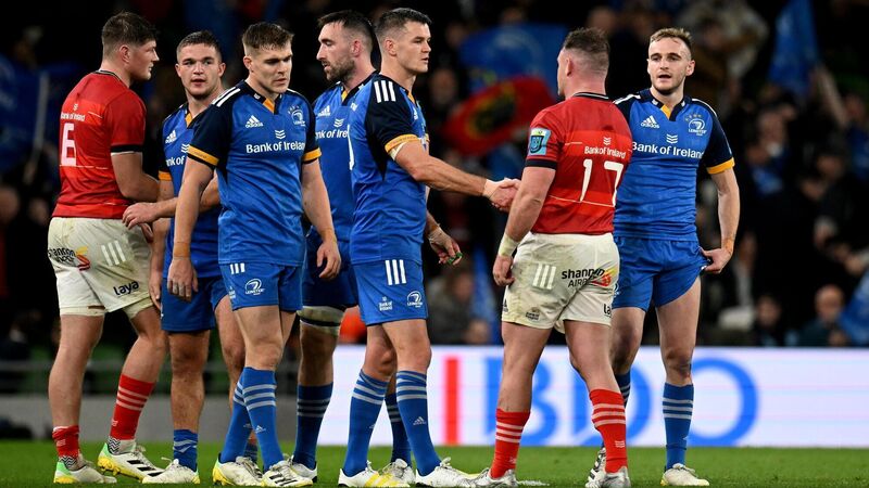 ALL RESPECT: Jonathan Sexton of Leinster shakes hands with Dave Kilcoyne of Munster after the United Rugby Championship match between Leinster and Munster at Aviva Stadium in Dublin. Pic: Harry Murphy/Sportsfile
