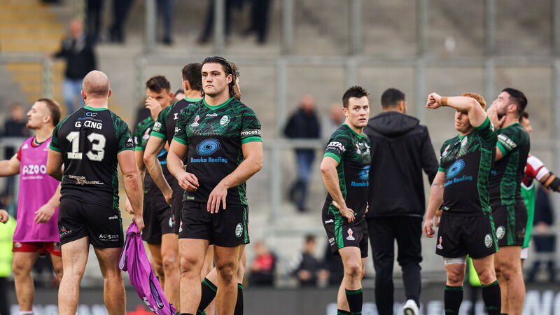 LAST CHANCE SALOON: Liam Byrne of Ireland, centre, looks dejected after the Rugby League World Cup Group C match between Lebanon and Ireland at Leigh Sports Village in Manchester, England. Pic: Paul Greenwood/Sportsfile
