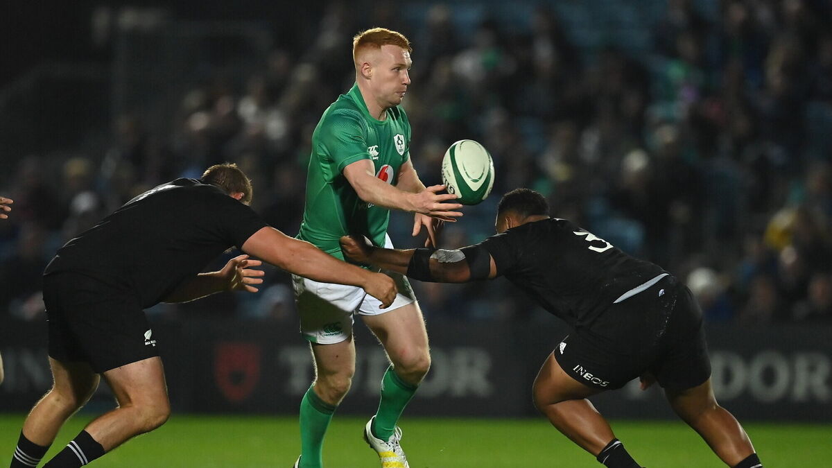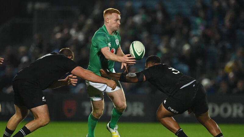 IN DOUBT: Ciaran Frawley of Ireland offloads as he is tackled by Marino Mikaele-Tuu and Tevita Mafileo of All Blacks during the match between Ireland A and All Blacks XV at RDS Arena in Dublin. Pic: Brendan Moran/Sportsfile