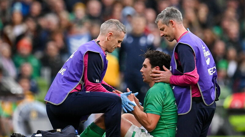 HEAVY HIT: Joey Carbery of Ireland receives medical attention during the game with Fiji at the Aviva Stadium on Saturday. Picture: Seb Daly/Sportsfile