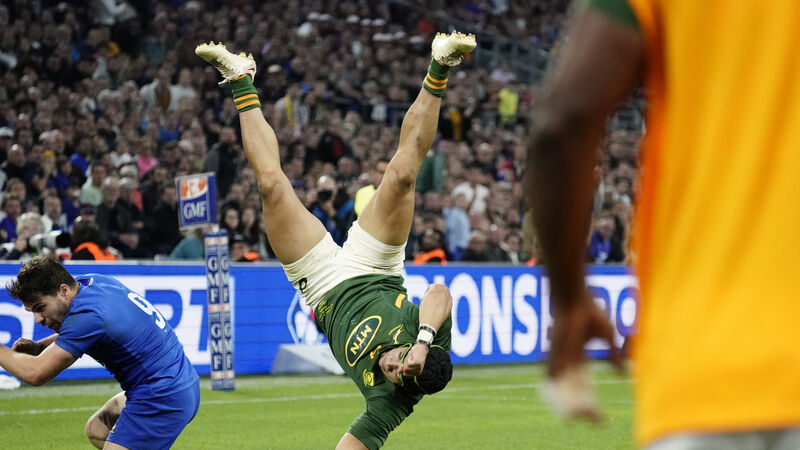 BANNED: Cheslin Kolbe of South Africa is tackled by Antoine Dupont of France which resulted in a red card