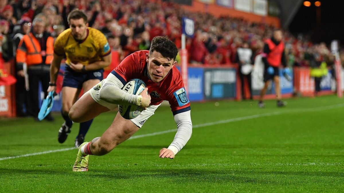 TRY: Munster's Calvin Nash takes the offload from Craig Casey to score Munster's opening try against Connacht at Thomond Park.Â